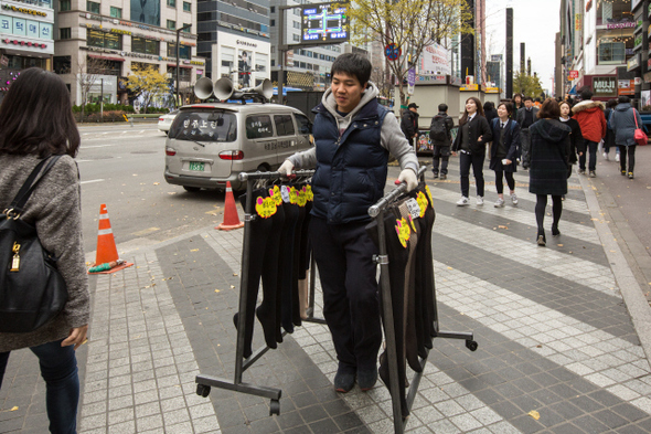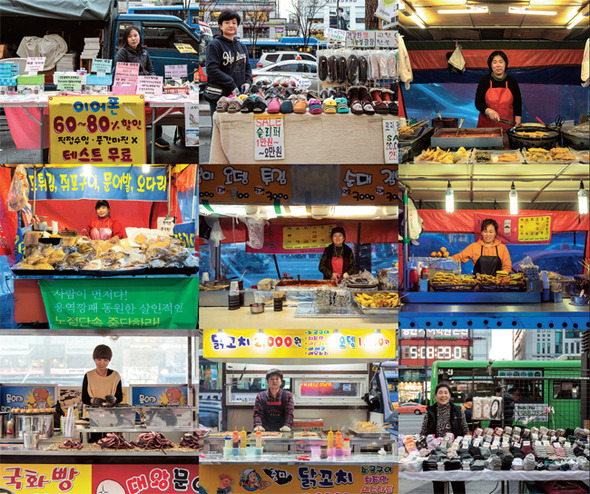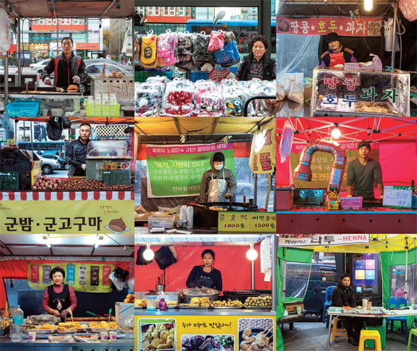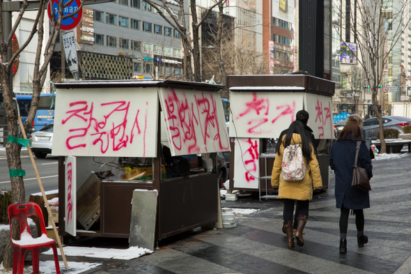 이 사진들은 한 달 전의 모습을 담은 것이다. 서울 지하철 2호선 강남역 11번 출구에서 북쪽으로 이어진 길에는 스무 개 남짓의 노점상이 있었다. 여든의 할머니는 1만원짜리 모자를, 서른셋의 청년은 2천원짜리 닭꼬치를 팔았다. 그리고 문어·호떡·떡볶이·어묵을 파는 포장마차들이 있었다. 지금 그 길엔 이들이 없다. 사흘이 멀다 하고 노점을 뒤집고 부수는 구청의 단속에 결국 노점상들은 사라져버렸다. 우리는 이제 화단이 들어선 거리를 걸으며 도시 경관이 좋아졌다고 느끼면서도 뜨끈한 어묵국물을 아쉬워할 것이다. 하지만 그 모습은 노점상들의 고단하고 치열했던 생활의 터전을 덮어버리고 우리가 만든 ‘강남스타일’이다.