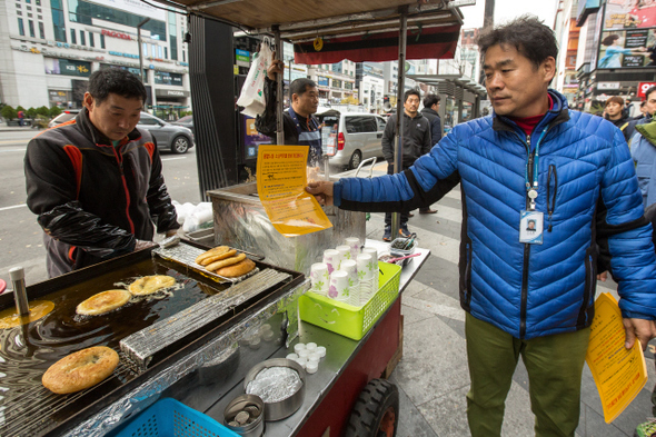 구청 단속반이 노점상에게 계고장을 전달하고 있다.