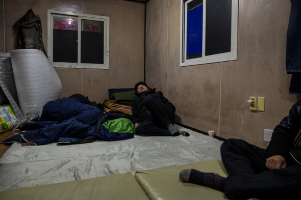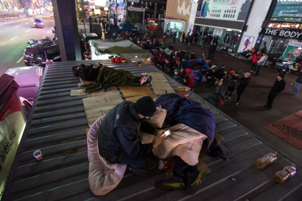 구청의 단속이 예상되는 날, 노점상들이 강남 거리에서 밤샘 노숙을 하며 대비하고 있다.