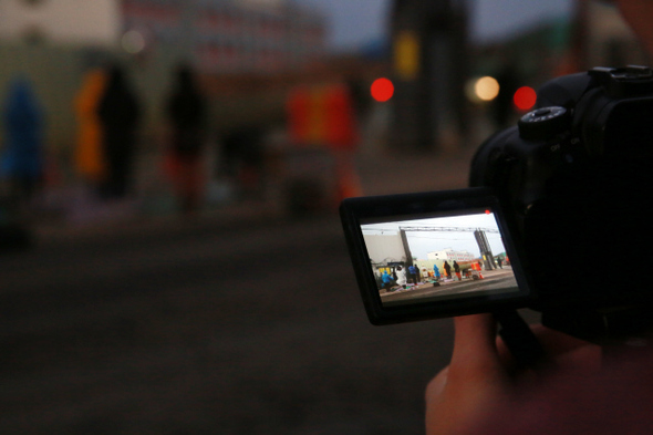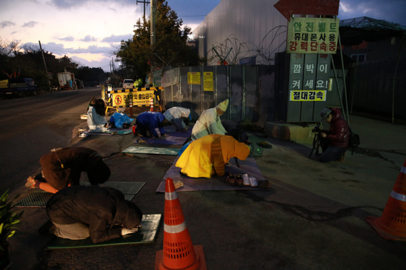 아침 7시 제주 해군기지 공사현장 정문에서 평화활동가와 영화학교 참가자들이 100배를 하는 동안 20대 청년팀이 촬영하고 있다.