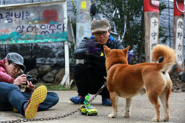 영화학교 참가자들이 사거리에서 개 ‘중덕이’를 촬영하고 있다.