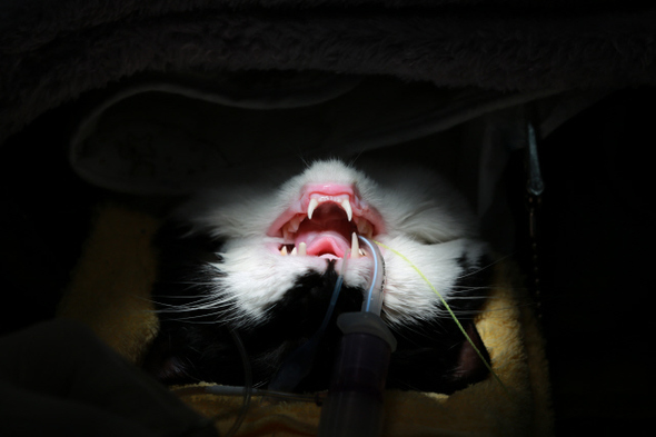 서울 강남구 청담동 ㅇ동물치과병원 김춘근 원장이 4시간의 치료를 마친 고양이를 회복실로 옮기고 있다.