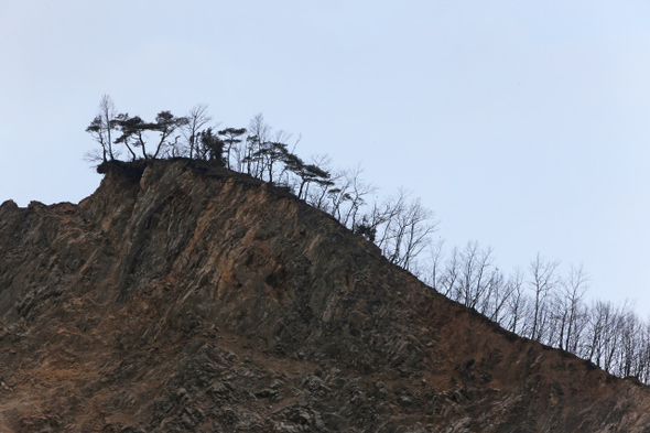 물에 잠길 도로를 대신해 만드는 순환도로는 나무를 잘라내고 산을 깎은 자리에 들어선다. 건설 중인 순환도로 뒤편 산비탈에 나무가 위태롭게 서 있다.