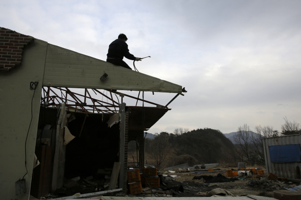 이주민들이 수몰지역에 있는 집 지붕에서 철골 구조물을 분리하고 있다.