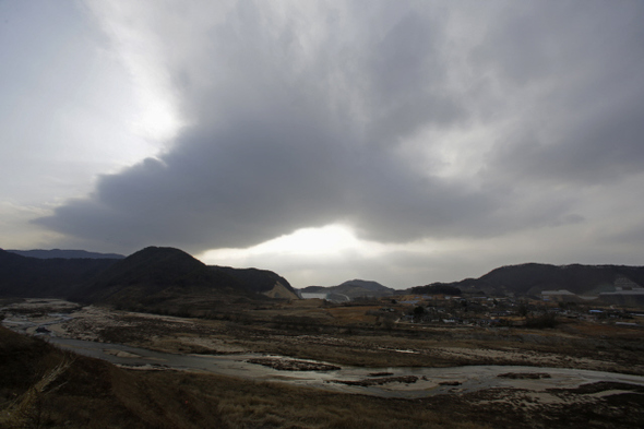 금강마을 뒤편으로 영주댐이 보인다. 마을을 물에 묻을 댐에서 시작된 구름이 마을과 내성천으로 시커멓게 번지고 있다.