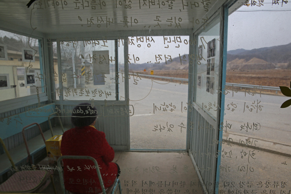 ‘기프실’ 버스정류장은 물에 묻힐 마을을 아쉬워하는 글과 사진과 그림으로 가득하다. 어느 주민이 대합실에서 버스를 기다리고 있다.