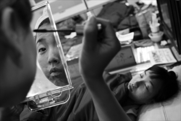 화장 합숙소에서 한 해고 승무원이 화장을 고치고 있다. 꽃 같던 청춘들이었다. 비정규직이 무엇인지 불법파견이 무엇인지도 모르던 20대의 어린 청춘들이 10년이란 긴 싸움 속에 가정을 이루고 아이의 엄마가 되었다. 2006년 5월21일.