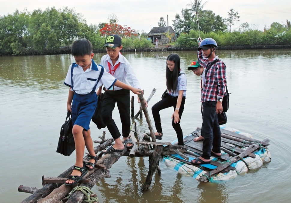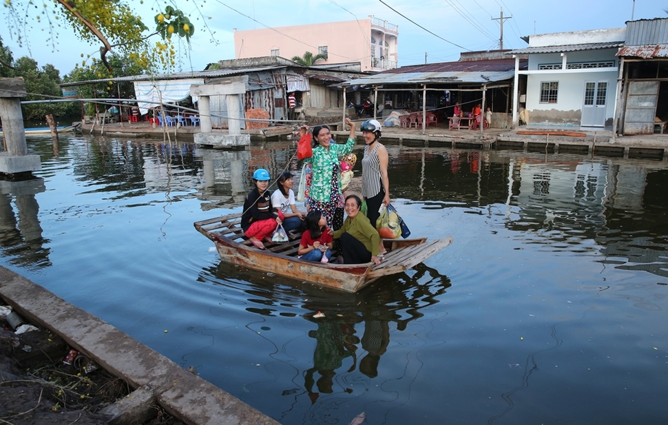 수백 개의 하천과 개울로 이루어진 지형 탓에 다리가 없는 지역에선 뗏목이나 원숭이다리로 건너다닌다. 뗏목을 탄 주민들 뒤로 까이랑 성당과 시장을 연결하게 될 다리의 교각이 보인다.