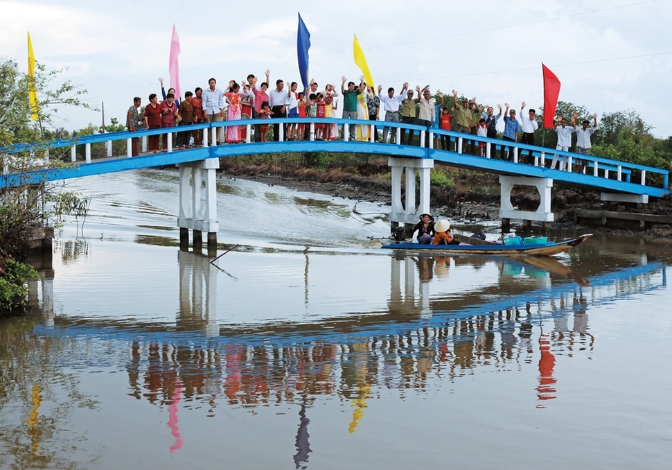 당끼우오완 베트남 조국전선인민위원회 까이늑현 부주석 등 베트남 주민들이 떤따오리 다리에서 손을 흔들며 다리 준공을 축하하고 있다.