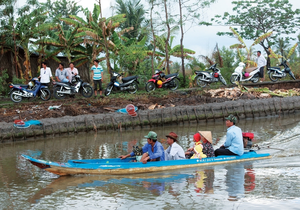 다리 준공식에 참석하기 위해 모인 사람들이 타고 온 오토바이가 제방에 늘어서 있다.