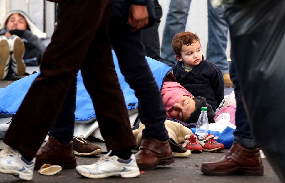 사람들이 지나다니는 바닥에 누워 쉬고 있는 부모의 곁을 아이가 지키고 있다. 독일 국경 앞 오스트리아 북부 브라우나우 난민캠프.