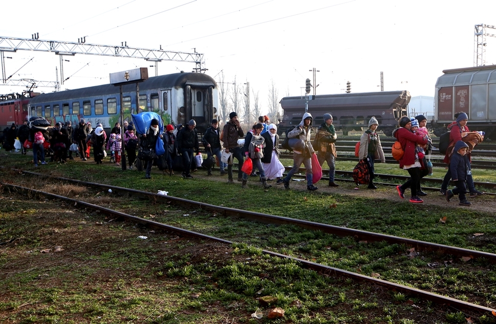 난민들이 크로아티아로 가는 기차를 타기 위해 걸어가고 있다. 세르비아 북쪽 시드.