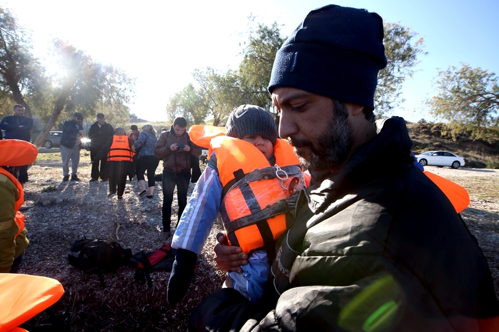난민을 태운 고무보트가 터키에서 출발해 그리스 레스보스 동쪽 해변에 도착했다. 보트를 타고 온 난민 어린이가 부모에게 안겨 있다.
