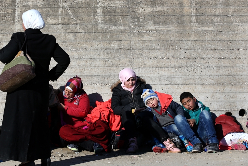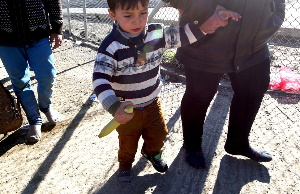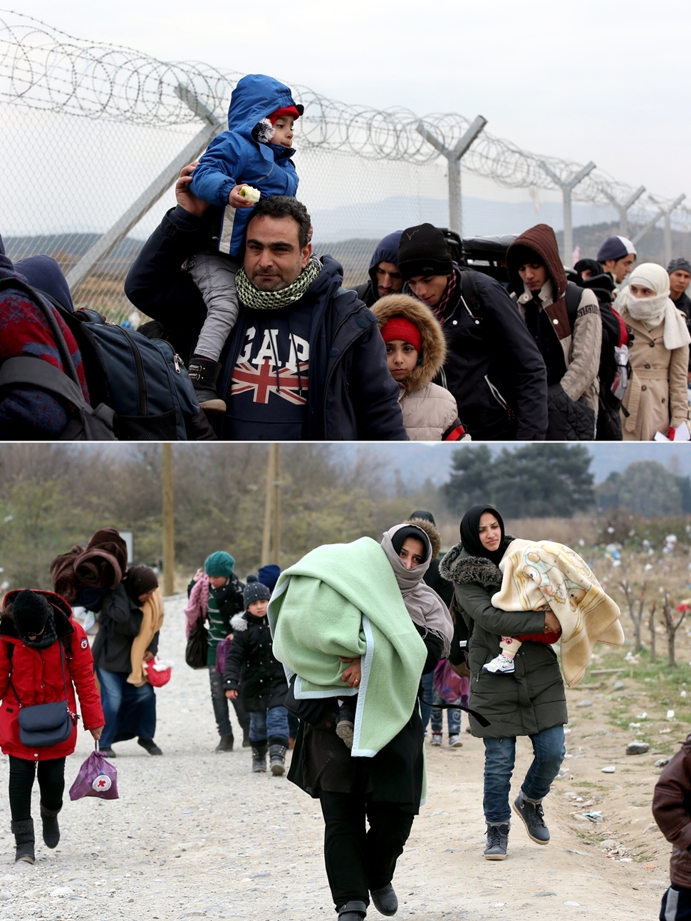 국경을 넘어 마케도니아로 들어가기 위해 길게 줄을 서 있다. 모포로 아이를 덮고 국경을 넘어 걸어오고 있다. 그리스 이도메니 국경지대.