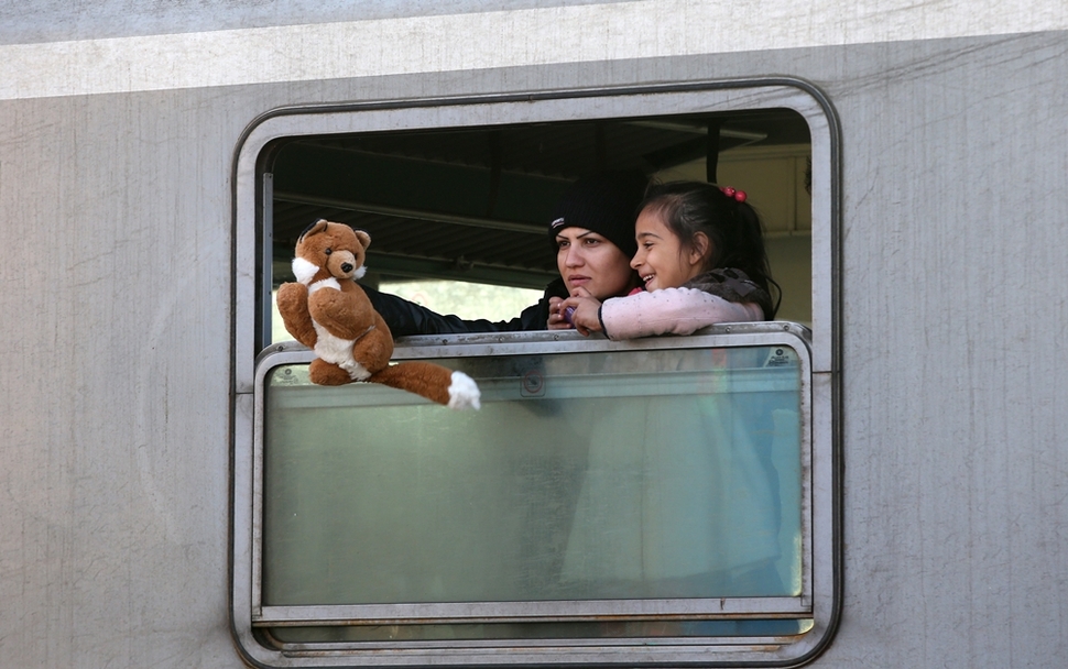 세르비아 북쪽 시드에서 크로아티아로 가는 기차에 오른 뒤 난민 아이가 창밖을 보고 있다.