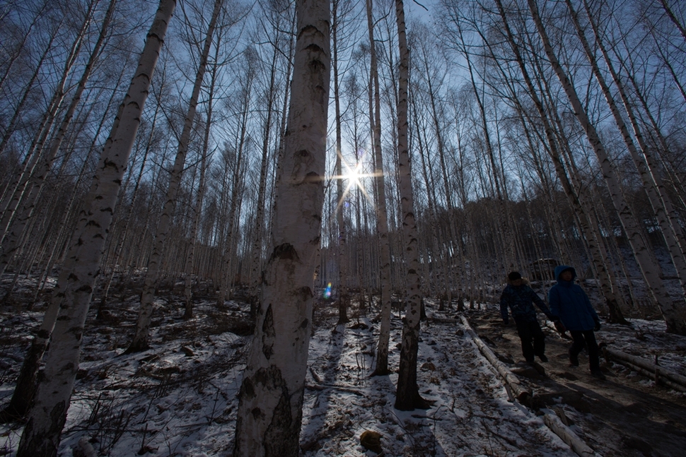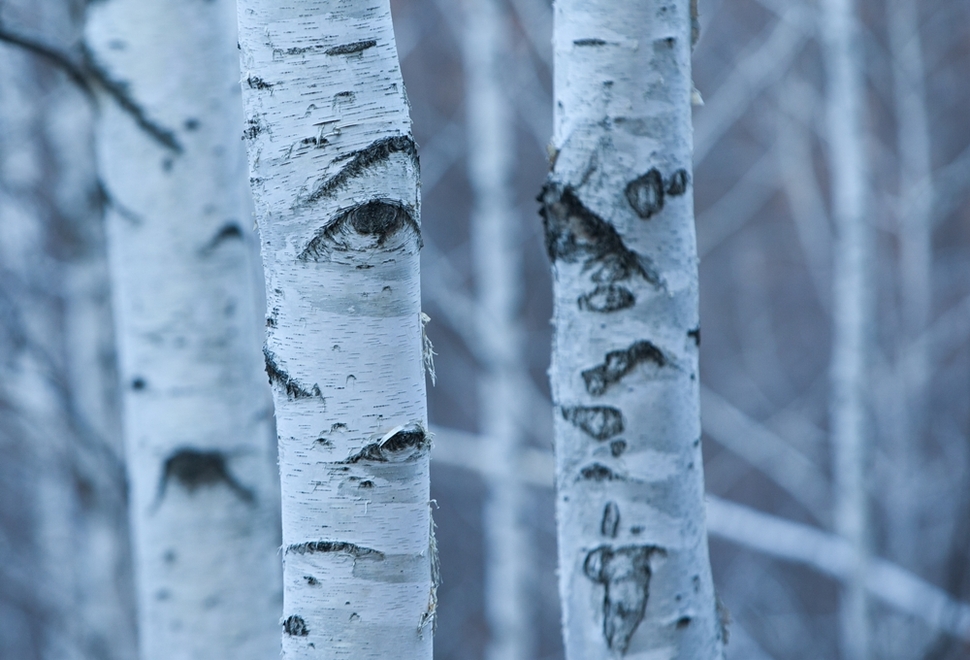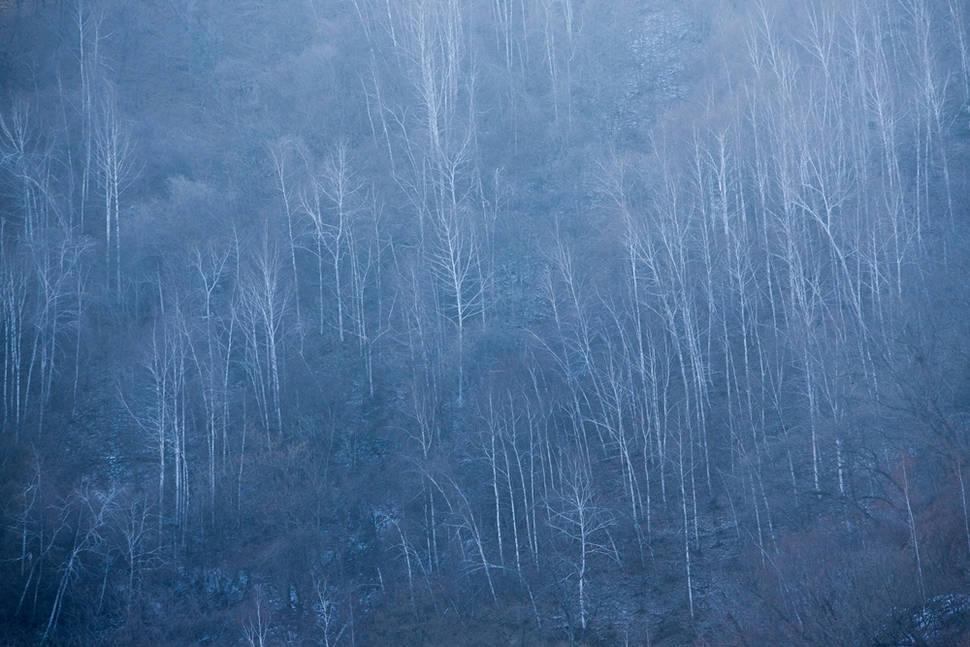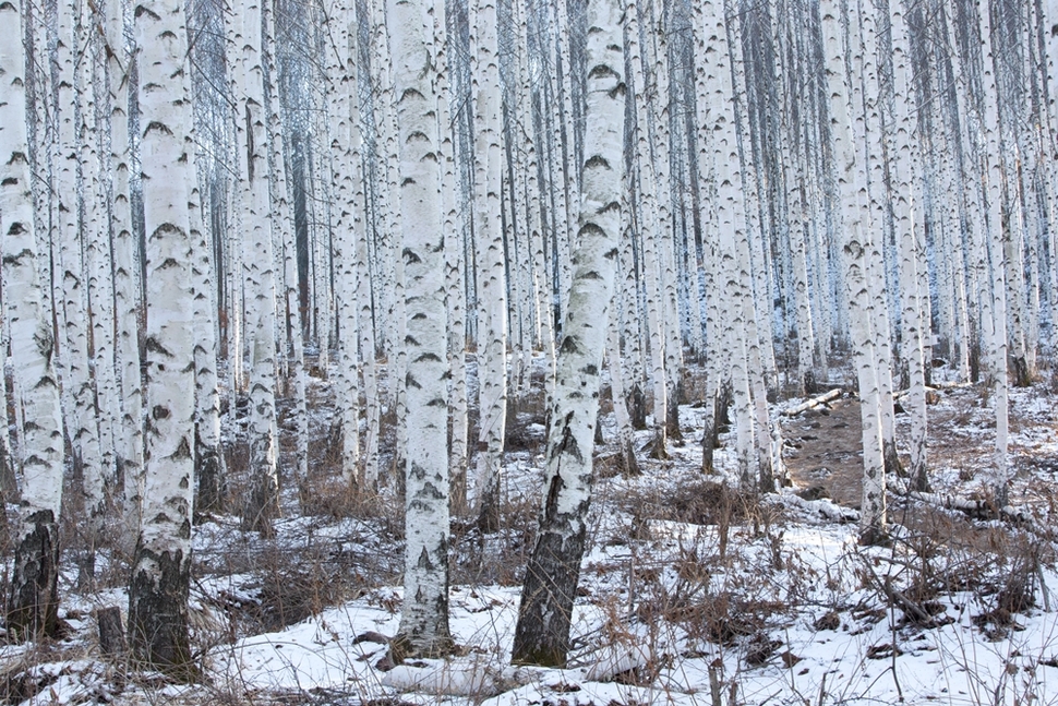추위엔 강해도 바람 많이 부는 곳을 싫어한다는 자작나무는 봉우리가 삭풍을 막아주는 남동쪽 사면에 모여 숲을 이루고 있다. 강원도 인제군 원대리 자작나무숲은 솔잎혹파리 피해를 입은 소나무를 벌채한 자리다. 전체 숲 138ha에 심은 69만 그루가 빼곡히 모여 순백의 세상을 만들고 있다. 마침 영하 20℃의 올겨울 최강 한파가 이어진 백색 숲에는 시베리아처럼 낮은 색 온도의 푸른빛마저 돈다. 차가운 겨울, 하얀 수피의 자작나무가 세로로 줄지어 선 숲의 겨울 풍경이 이국적이다.