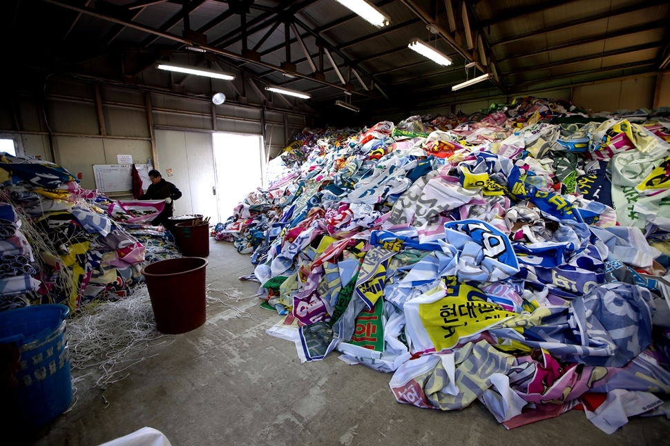 철거한 현수막은 폐기물로 소각된다. 현수막을 재활용하는 녹색발전소에는 하루에 1천 장이 넘는 현수막이 쏟아져 들어온다. 철거한 그 자리에 누군가 또 다른 현수막을 내걸 것이다. 4월 총선을 앞두고 정당별 정책 홍보 문구가 담긴 현수막들도 등장할 것이다.