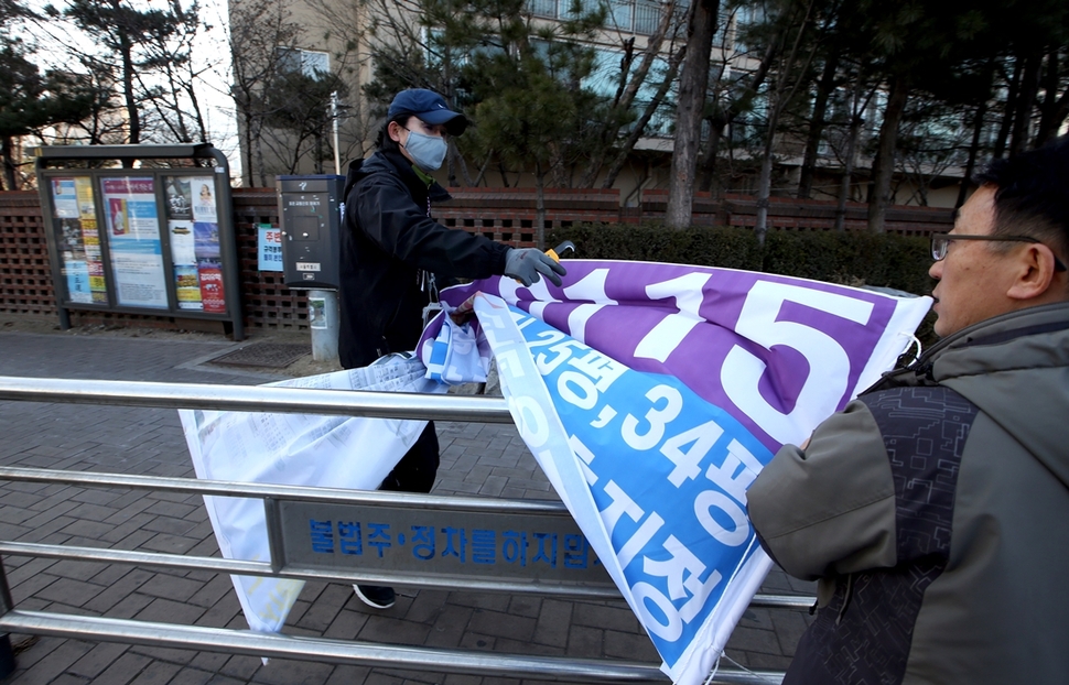 불법 광고물 수거보상제에 참여한 서울 중랑구 구민들이 현수막을 철거하고 있다.