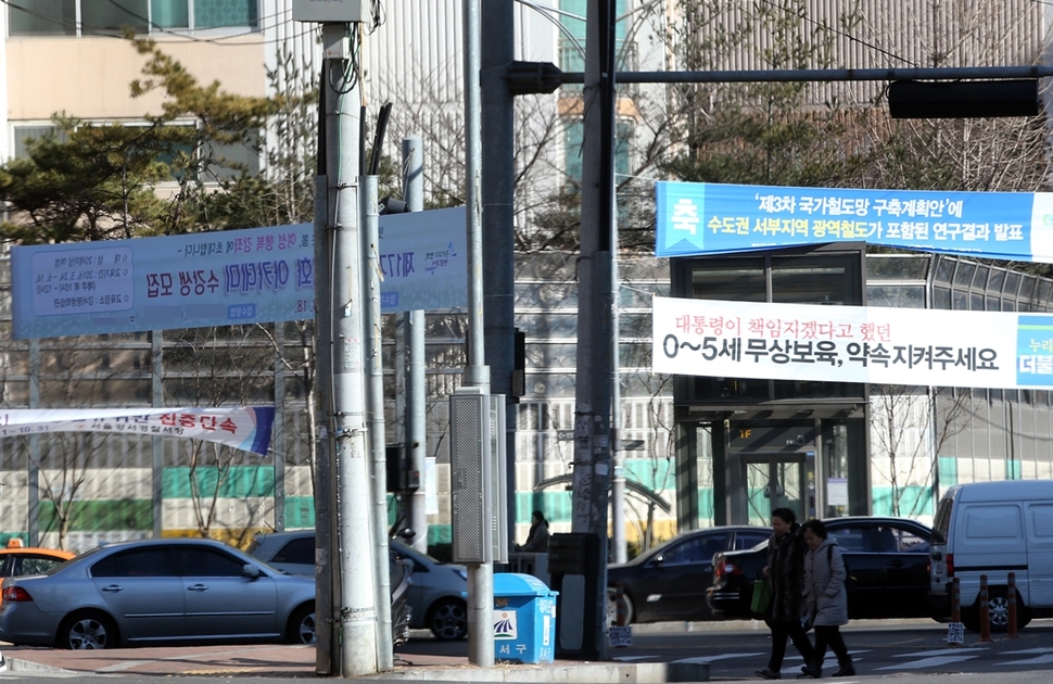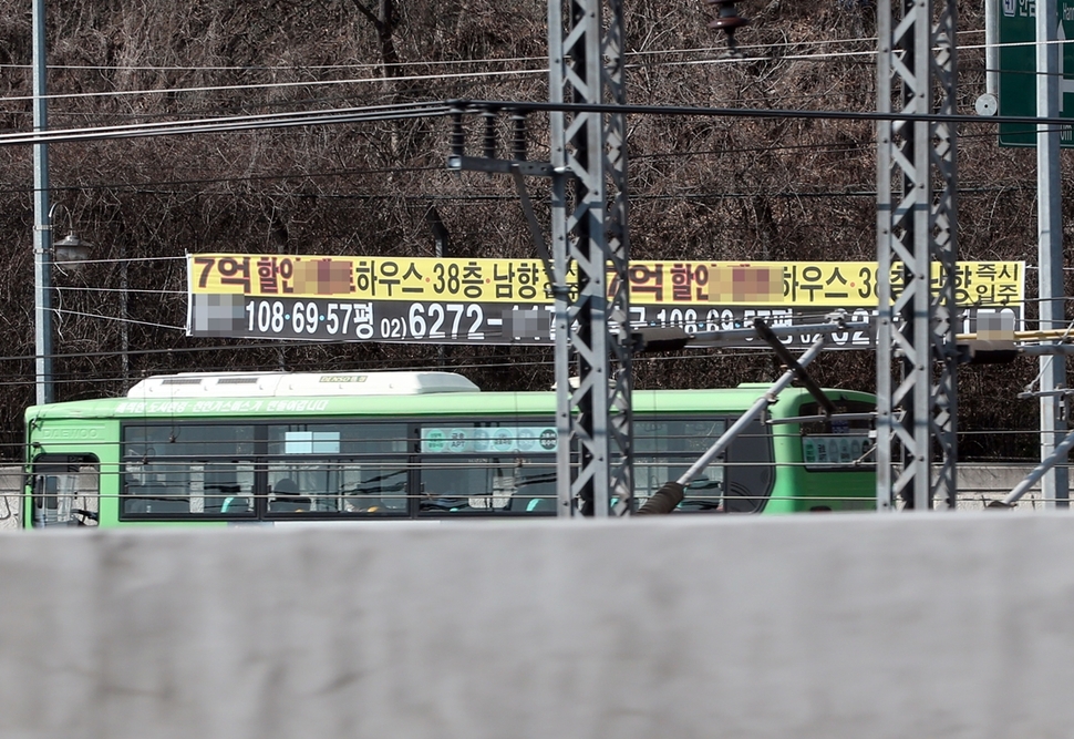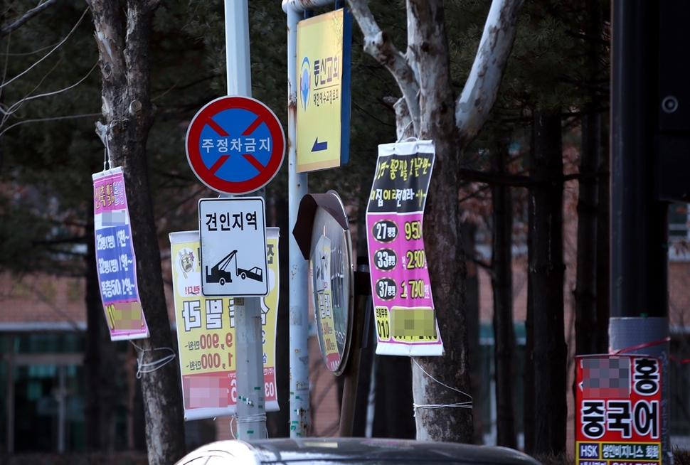 차량이나 사람이 많이 이동하는 도로에 불법 광고물이 어지럽게 걸려 있다.