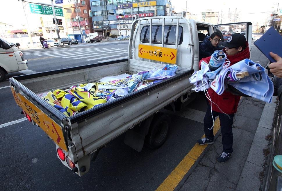 수거해온 불법 현수막을 차량으로 옮기고 있다.
