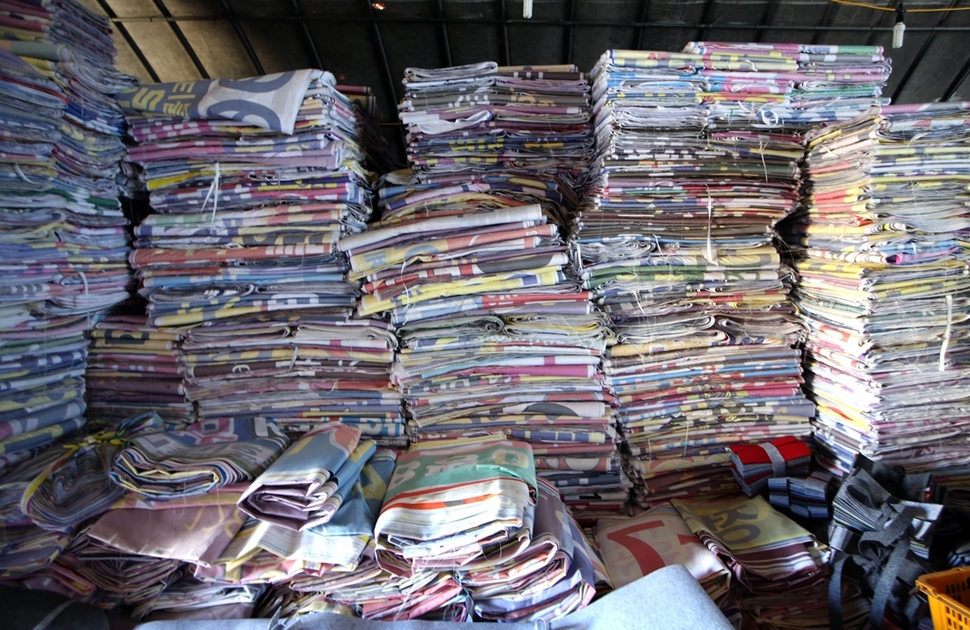 현수막으로 재활용한 분리수거용 바구니와 마대가 창고에 차곡차곡 쌓여 있다.