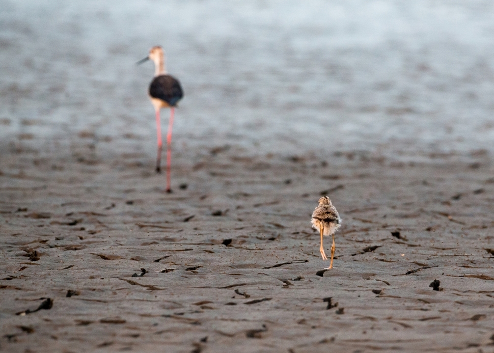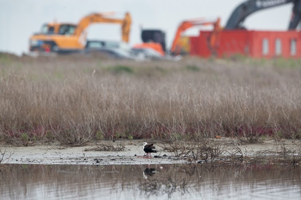 부화한 지 2주 정도 된 장다리물떼새가 어미와 함께 갯벌 매립지를 지나 물가로 가고 있다. 중장비로 습지를 파헤치고 도랑을 만들면서 습지에 물이 급격하게 줄어들었다. 어린 새는 숨을 데가 전혀 없어 천적의 위험에 고스란히 노출된 땅을 지나 물 있는 곳까지 한참 걸어나가야 한다. (6월26일)