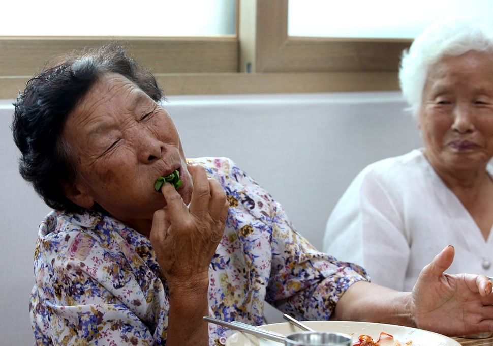 충남 공주시 정안면 어물리 마을 최병남(83) 할머니가 마을에서 준비한 저녁밥을 먹으며 즐거워한다.