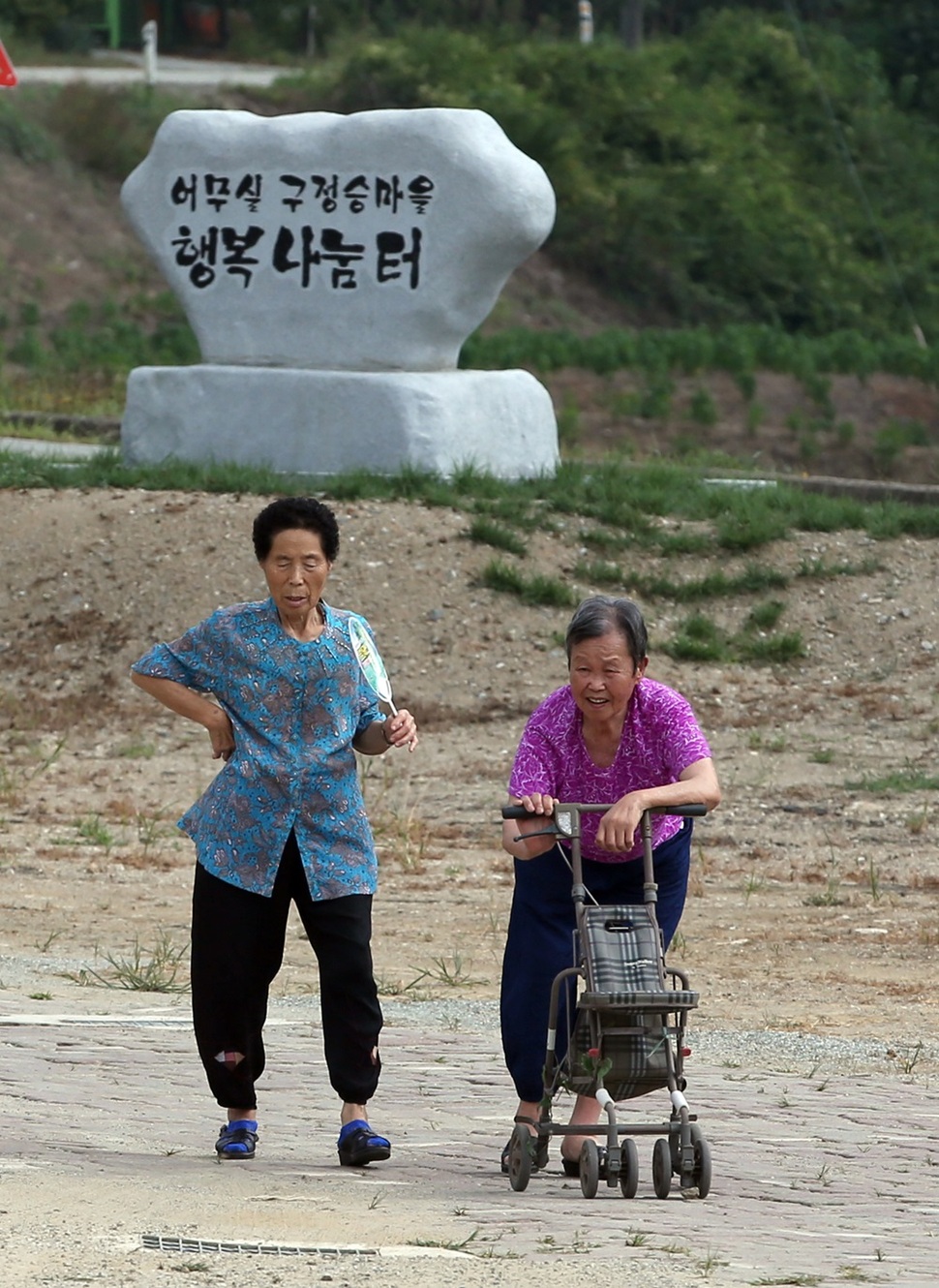 거동이 불편한 마을 주민이 보조기구를 이용해 마을회관으로 걸어오고 있다.