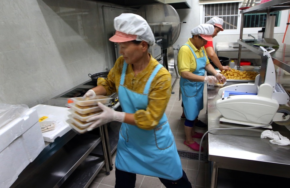 마을 주민들이 충남 공주 한일고등학교 야식을 납품하기 위해 음식을 만들고 있다.