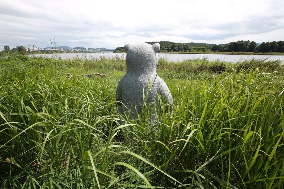 사람 키를 훌쩍 넘는 수풀로 뒤덮인 산책로를 헤집고 들어가자 곰 석상이 눈에 들어온다.