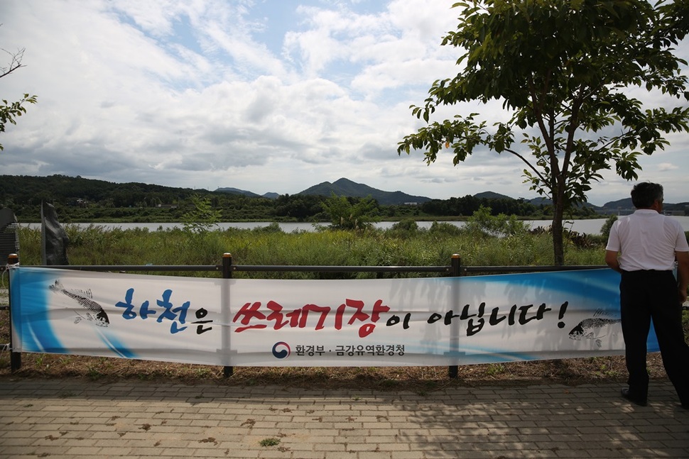 ‘쓰레기를 버리지 말라’고 쓰인 현수막이 공주시 우성면 금강 수변공원에 걸려 있다.