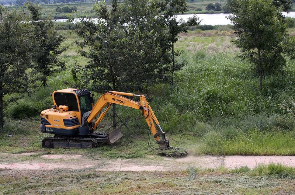 명절을 앞두고 4대강 인근에서 제초 작업이 진행되고 있다. 충남 부여군 백제보 우안에서는 포클레인이 제초 작업에 투입됐다. 굴착기 한 대가 삽 대신 톱날을 달고 강변에 무성한 풀을 베어나갔다. 둔탁한 기계음과 함께 바닥의 흙과 자갈이 튀면서 흙먼지가 날렸다.