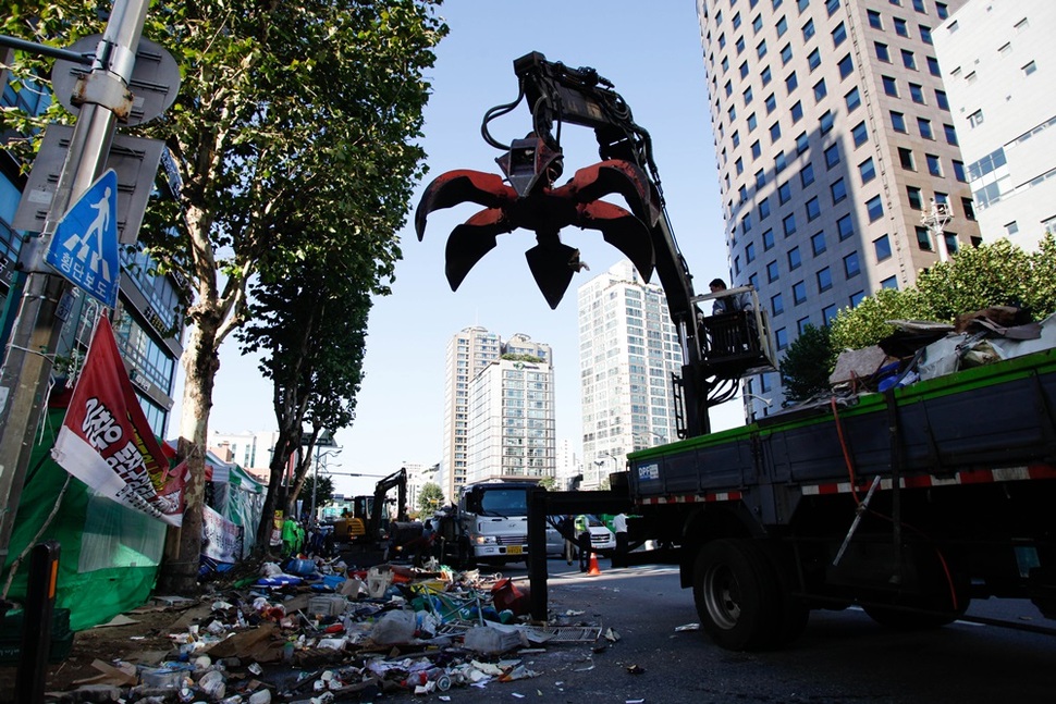 10월2일 새벽, 비가 오는 가운데 굴착기를 앞세워 몰려온 용역반에 의해 노점은 모두 철거됐다. 동작구청은 노량진 컵밥 거리의 성과를 홍보하면서 다른 한쪽에선 강제 철거하는 이중적인 모습을 보였다. 동작구청 건물에 걸린 슬로건 ‘행복한 변화, 사람 사는 동작’에 노점상은 전혀 포함되지 않은 모양이다.