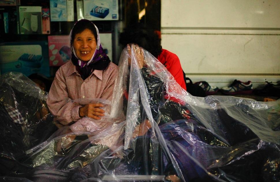 노점상들이 동작구청의 행정대집행을 초조히 기다리며 비닐에 의지해 거리에서 밤을 새우고 있다.