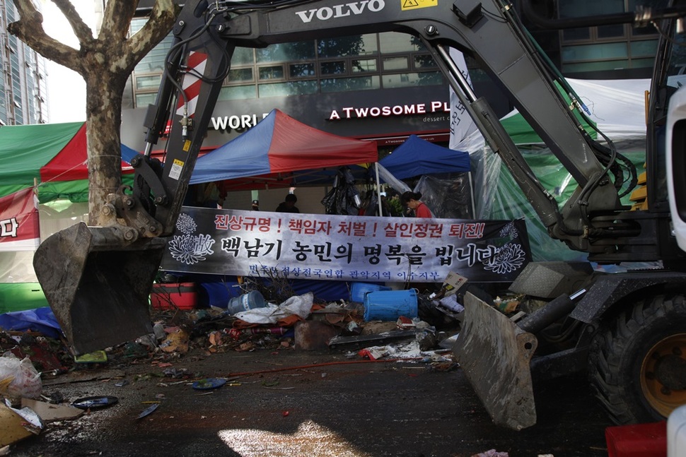 백남기 농민 추모 플래카드가 노점 철거 잔해 사이로 위태롭게 걸려 있다.