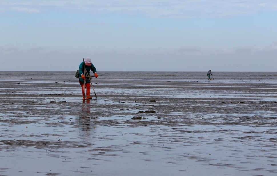 유부도 어민들이 단단한 모래펄에서 ‘그레(조개잡이 전통 도구)질’을 하고 있다. 그레에 커다란 말백합이 걸리면 ‘철커덕’ 소리가 나고, 바지락이나 동죽이 걸리면 ‘삐걱’ 소리가 난다.