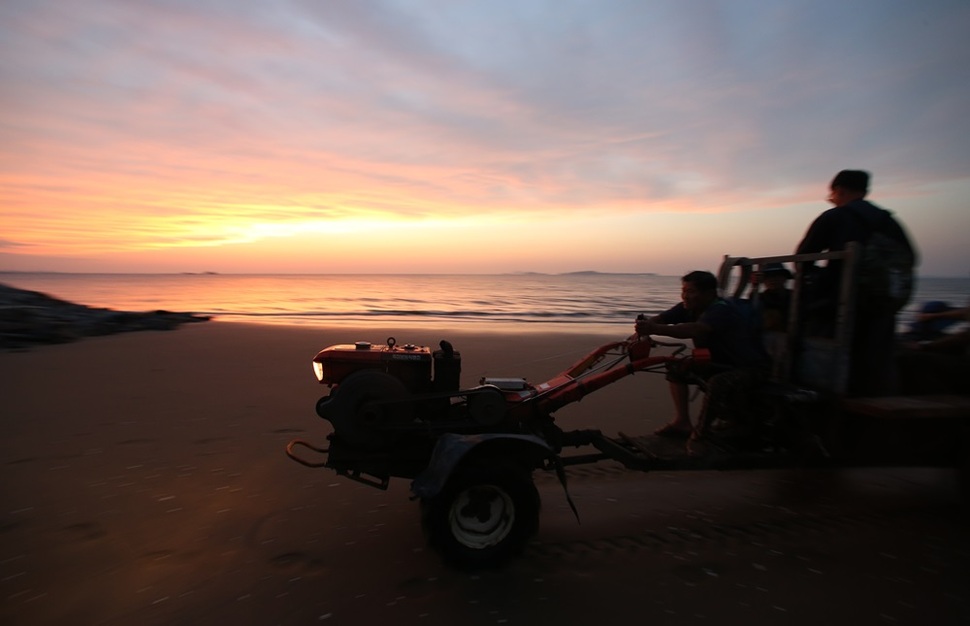 경운기는 섬의 유일한 교통수단이다. 사람을 태우고 석양의 해안가를 달린다.
