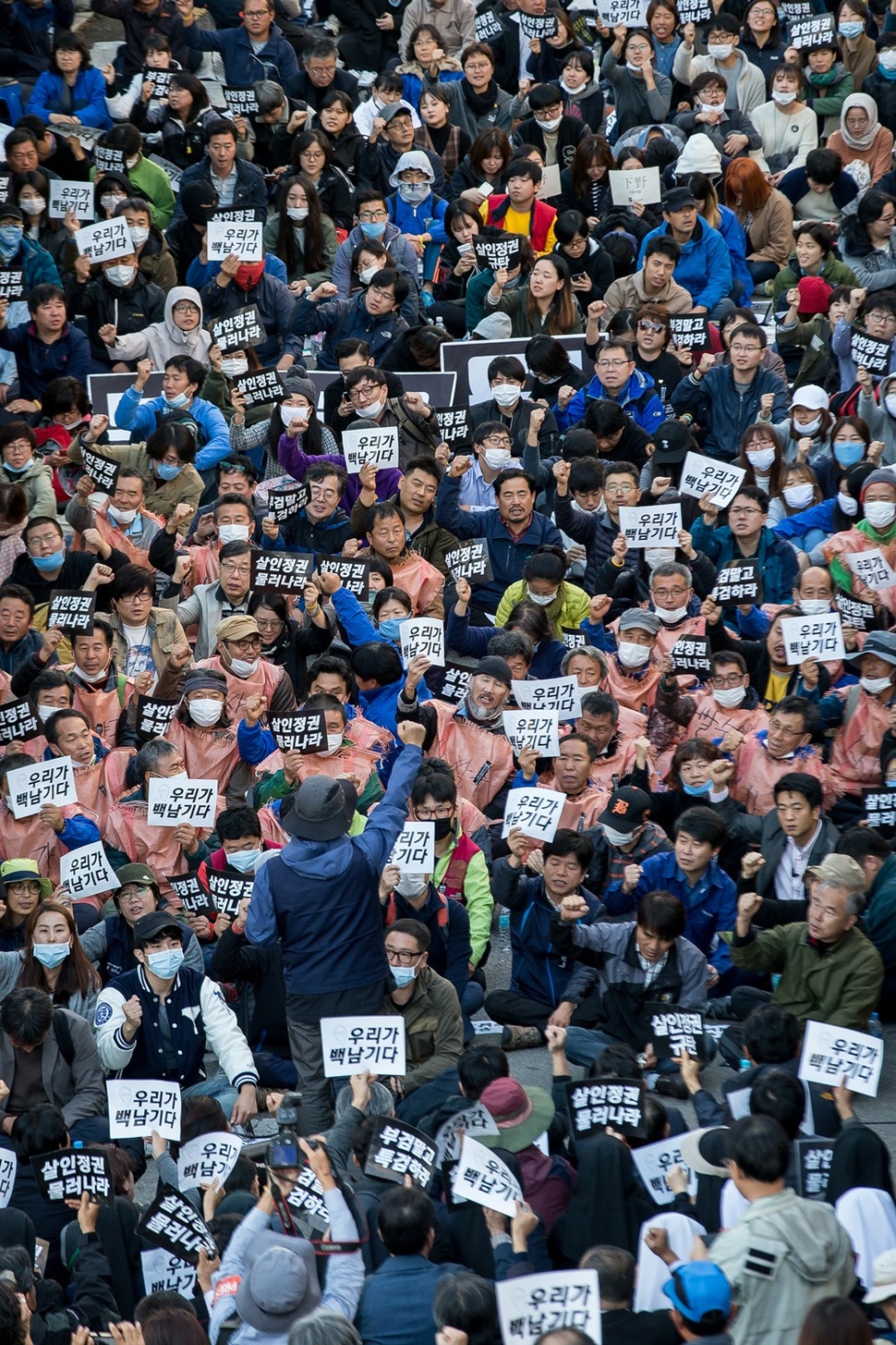 10월25일 오후 경찰이 나타나자 시민들이 영안실 입구를 막고 집회를 했다.