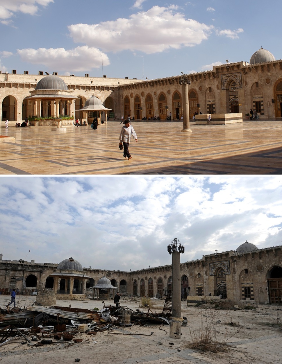 시리아 북부 알레포의 전쟁 전후 사진이다. 기원전 20세기부터 형성된 인류 역사에서 가장 오래된 도시 중 하나인 알레포는 유네스코 세계유산으로 지정된 곳이다. 2012년 시작된 시리아 정부군과 반군 간의 전투는 주변국의 대리전으로 번졌다. 2016년 12월 시리아 정부군과 러시아 연합군의 승리로 전쟁이 끝났다. 4년간의 전쟁으로 시가지 전체가 온전한 곳이 없으며, 3만 명 넘는 사람이 희생된 것으로 알려진다.