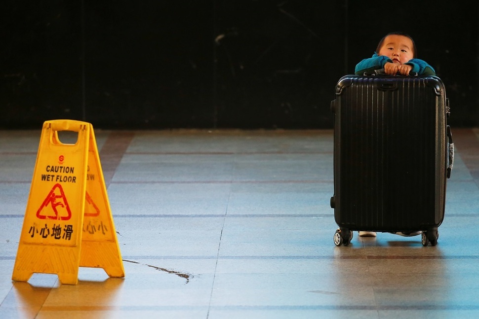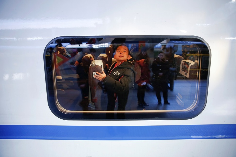 베이징 중앙역에서 출발하는 열차에서 자리를 확인하는 소년.