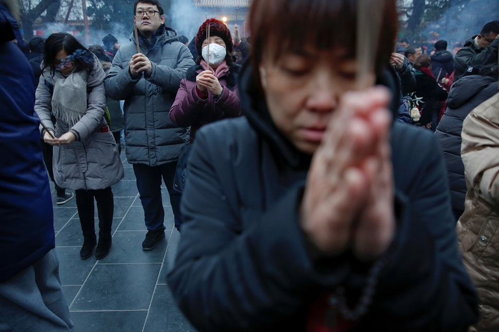 음력 1월1일(양력 1월28일) 라마교 사원인 베이징 옹허궁에서 향을 피우며 행운을 비는 사람들.