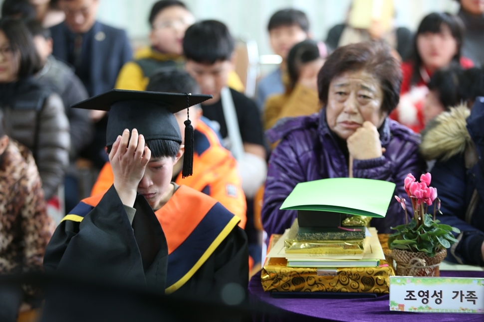 추산초등학교 졸업식에서 조영성 졸업생의 할머니가 눈물을 닦는 손자를 보며 안쓰러워하고 있다.