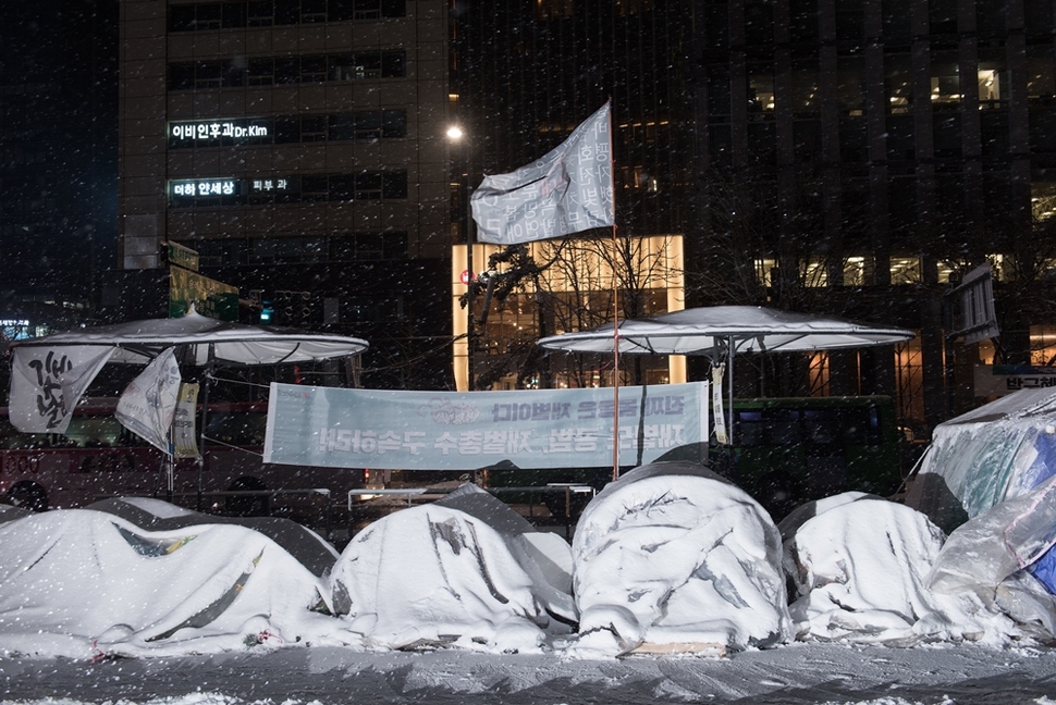 용산 참사 8주기를 맞은 1월20일, ‘박근혜 퇴진 광화문 캠핑촌’에 함박눈이 쌓였다. 농성이 길어지며 ‘입주민’의 생활고도 쌓여간다. 어느새 넉 달을 앞두고 있다. 박근혜만 바꾸자고 이러는 것일까. 그자를 바꾸면, 이제 다시 눈물의 촛불을 들지 않아도 되는 것일까. 그들에게 요구한 만큼 우리도 대답해야 한다.