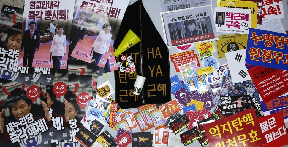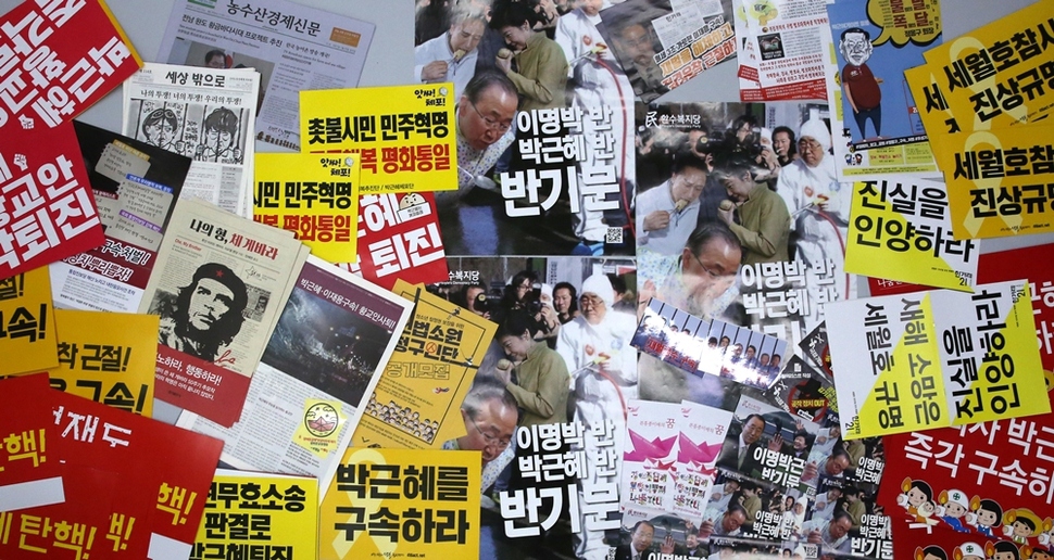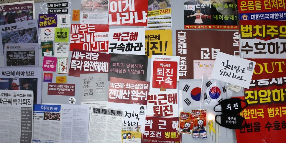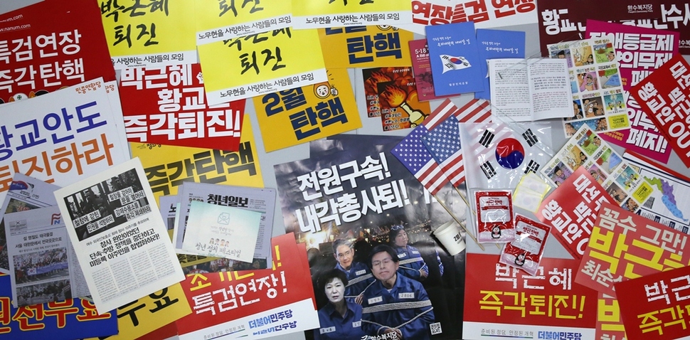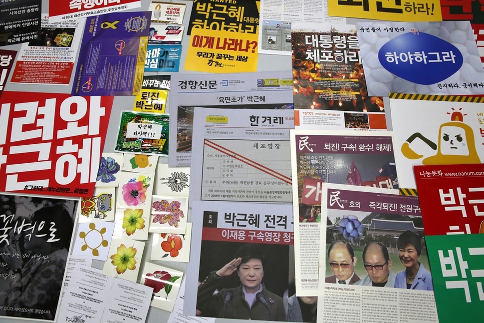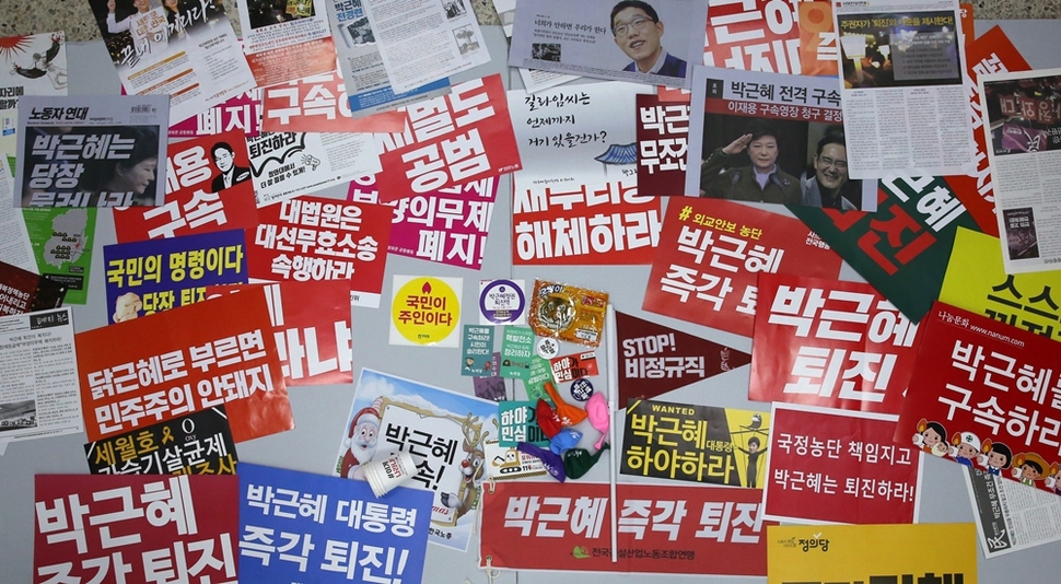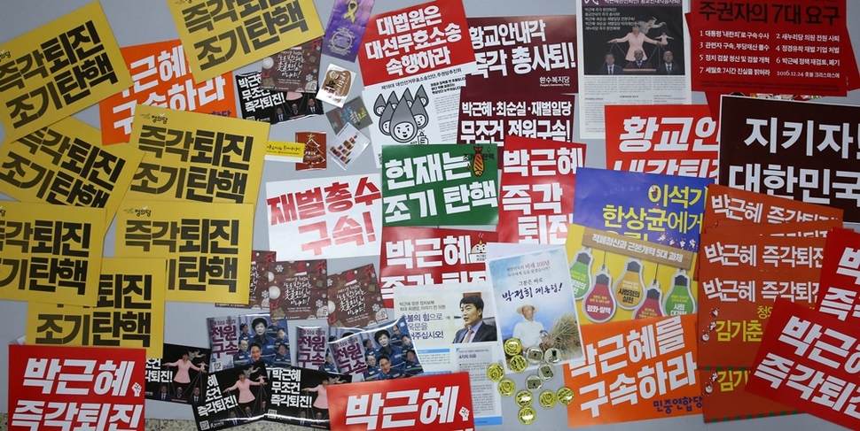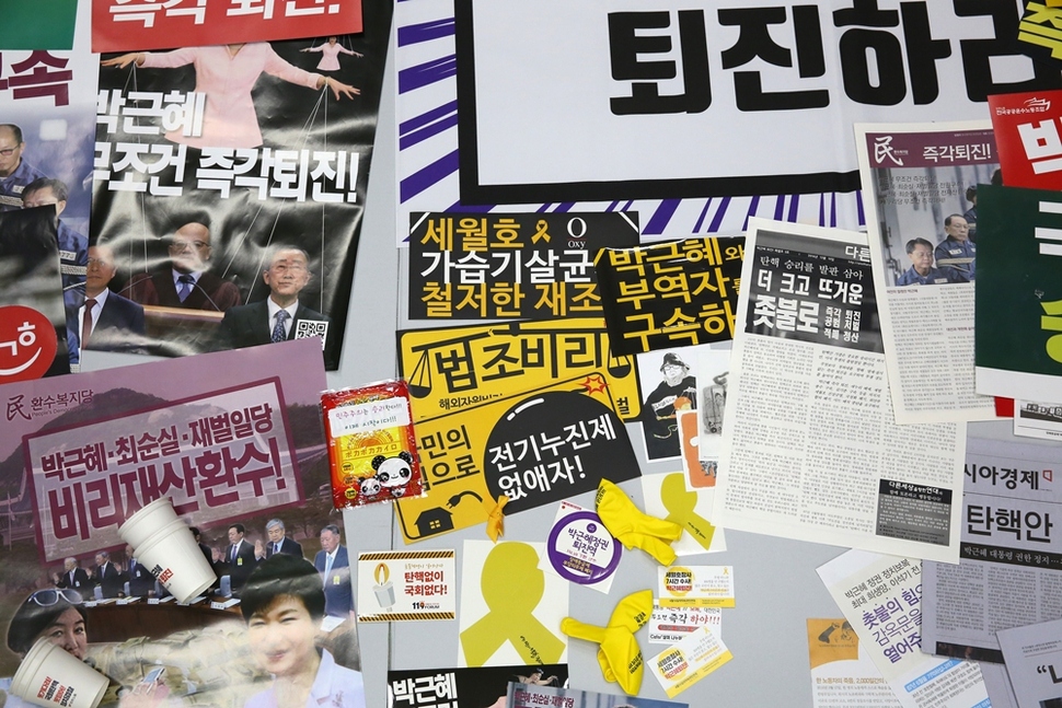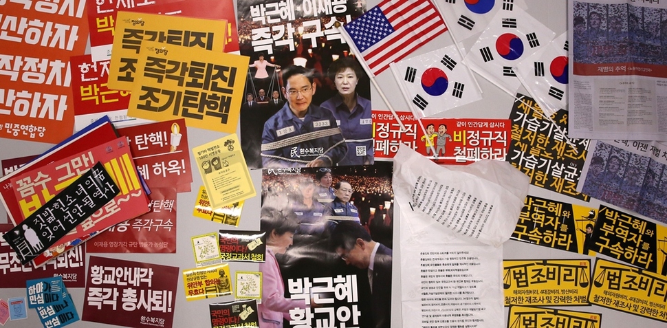 켜지고 꺼지고를 거듭하면서 촛불은 해를 넘겼다. 2월25일은 17번째 촛불. 2016년 10월29일 서울 광화문광장에서 3만 명(주최 쪽 추산)으로 시작한 ‘촛불 민심’은 매주 점등과 소등을 반복해왔다. 그것은 한국 사회의 위기를 타전하는 ‘모스부호’였다. 촛불은 우리 스스로 우리 사회의 난파와 파국을 막으려는 비상 점멸등이고 ‘SOS’다. 신호는 이미 1300만(주최 쪽 누적 추산)을 넘겼다. 서울역사박물관은 그 신호를 11월19일(4차 촛불집회)부터 수집했다. 촛불 시민들이 들었던 손팻말과 깃발, 핫팩, 신문·잡지 호외판, 호루라기 등이 물경 500점을 넘는다. 지금도 서울역사박물관 유물관리과 직원들은 매주 광화문광장에서 ‘촛불 자료’를 수집하고 있다. 서울역사박물관 박현욱 학예연구부장의 말이다. “박물관의 고유 기능이다. 과거 기록도 수집하지만 미래 유산이 될 만한 것도 수집해야 한다. 도시사 박물관으로서 서울역사박물관의 소명이다. ‘현재’를 가감 없이 보여주는 자료를 수집해두어야 후세에 올바른 시각으로 평가할 수 있는 것이다. 앞으로도 중요한 사건이 일어나면 자료 수집팀을 가동하겠다.” 서울역사박물관은 올해 6월 ‘1987년 6월항쟁’ 30년을 기념하는 전시회에 이 기록을 함께 전시할 참이다. 기록해야 기억한다. 나치 홀로코스트의 아비규환에서 생존한 엘리 위젤(1928~2016, 1986년 노벨평화상 수상)의 말을 기억한다. “기억한다는 것은 과거와 현재, 과거와 미래의 연결고리를 만드는 것이다. 기억한다는 것은 인류애에 대한 인간의 신념을 확인하는 것이고, 우리의 덧없이 지나가는 노력들에 의미를 부여하는 것이다. 기억의 목적은 정의에 대한 존엄을 회복하는 것이다.”