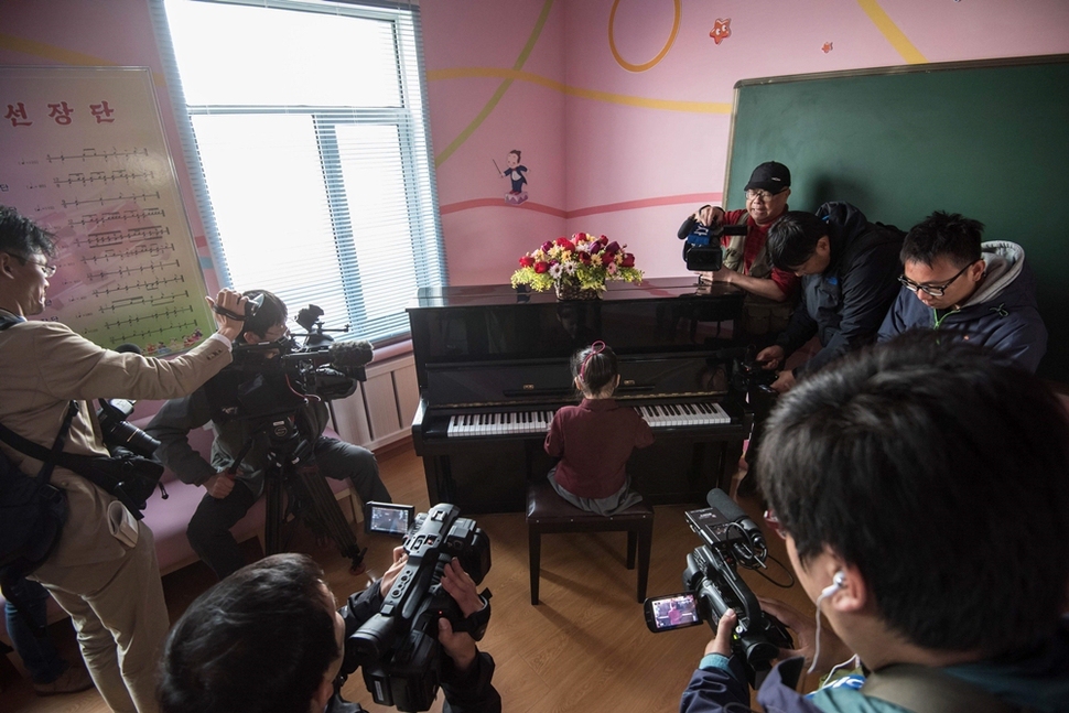 4월13일 북한 평양 외곽에 위치한 유치원. 한 어린이가 외신 기자들 앞에서 피아노를 연주하고 있다.