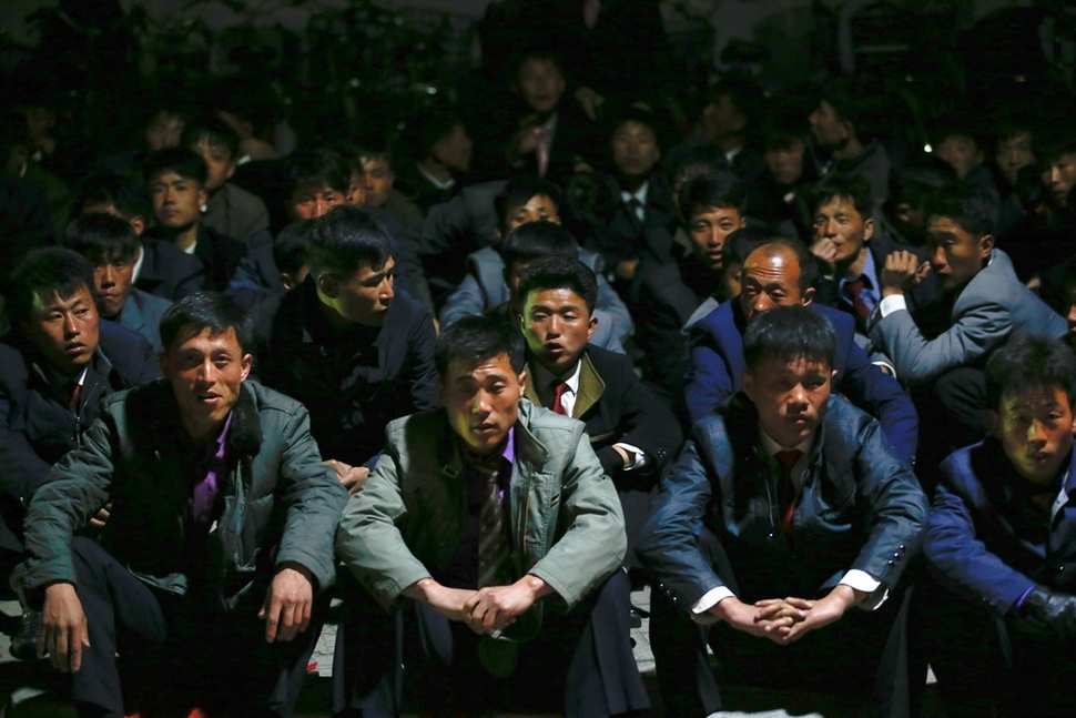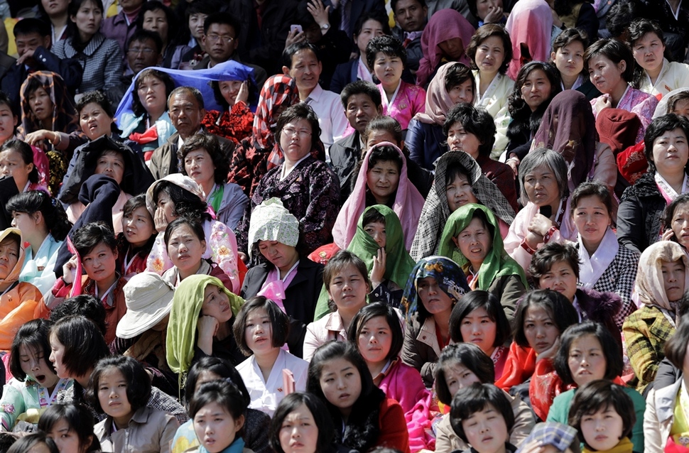 4월9일 북한 주민들이 평양 마라톤 대회를 보기 위해 김일성 경기장에 앉아 아침 햇살을 피하고 있다. 평양 마라톤 대회에는 많은 외국 관광객들이 참가한다.