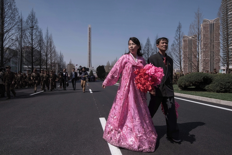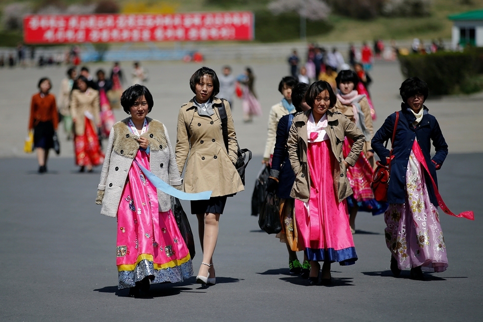 4월12일 김일성 탄생 105주년 기념행사 준비로 한복을 차려입은 여성들.