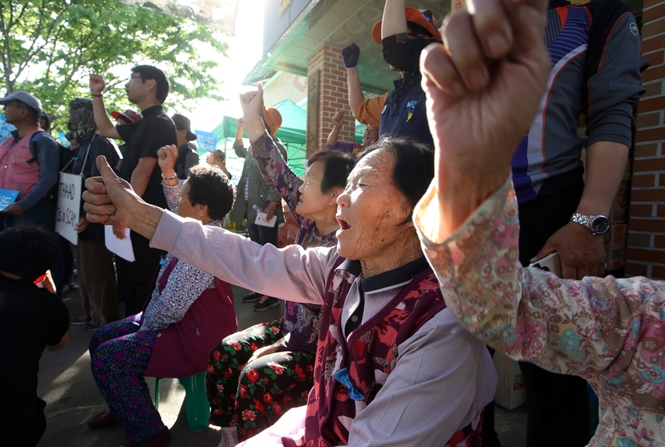 장경순 할머니가 5월2일 마을회관 앞에서 열린 사드 장비 추가 반입 반대 집회에 참석해 “사드 말고 평화를” 외치고 있다.