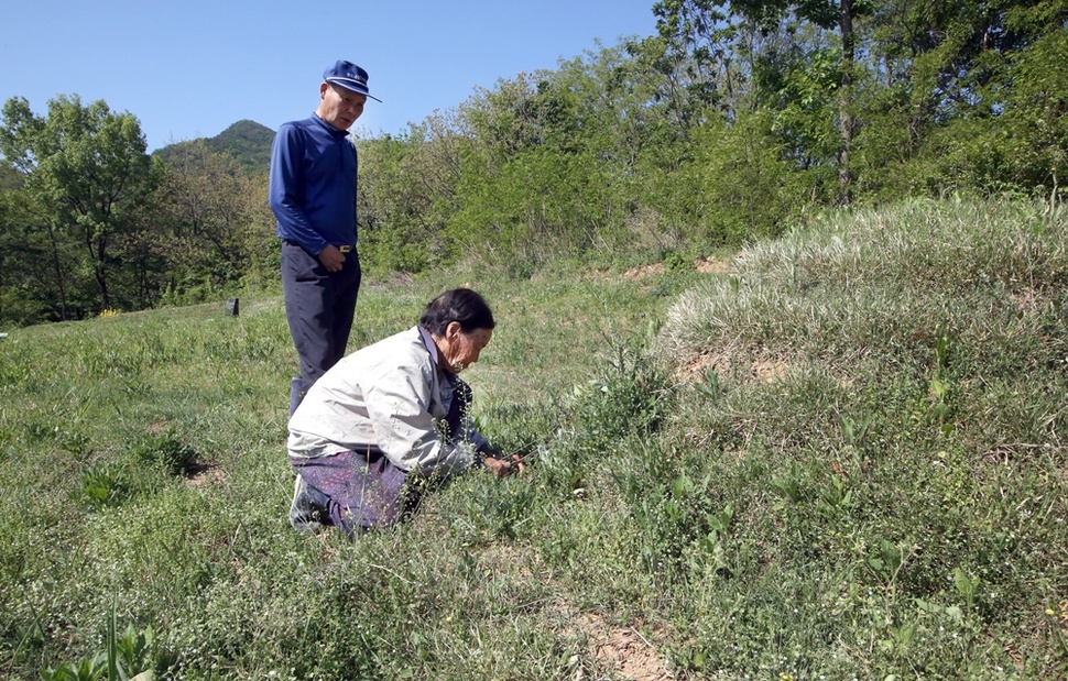 5월3일 오전 휴일을 맞아 집에 온 아들 홍(62)씨가 어머니와 함께 벌초를 하고 있다.