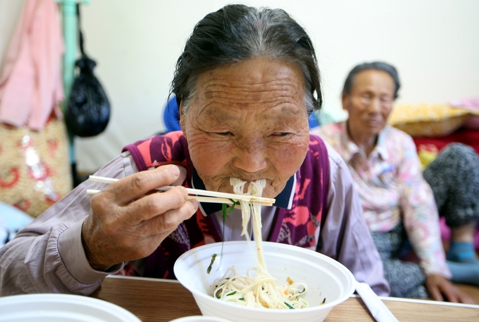 장경순 할머니가 마을회관에서 제공하는 국수를 먹고 있다.
